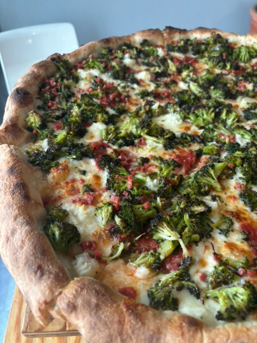 White pie, dollops of marinara, confit garlic mashed potatoes, charred bro,coli, diced hot soppressatta.
