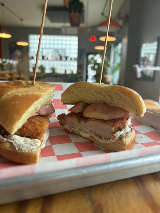 Panko crusted pork loin, red wine marinated apples, whipped cream cheese with rosemary and Calabrian chillies.
