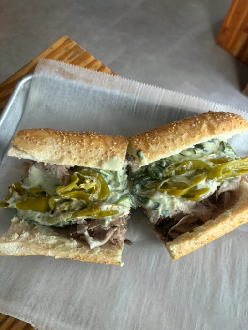 Roast pork, cream of spinach, apple cider, and herb marinated long hots. .